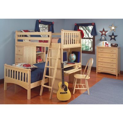 Super cool - we call it the Cooley SSS Twin Loft Bed 2. Not only is this set sleek and stylish but also economical. Save space and money while adding versatility to your kid's bedroom. One end of the loft features a study desk with a pull-out keyboard tray and a smaller drawer for storage. The opposite end features a 4-drawer dresser backed by a 3-shelf bookcase. Plus you can choose to add a second twin bed on the floor facing perpendicular to the loft.While this set is awesome for kids it's great for parents too because of its superior safety features. Cleans easily with warm water and mild soap.About the Manufacturer:Bolton Furniture is proud to offer consumers quality wood pieces at affordable prices since the early 1900s. Located in Vermont Bolton selects its lumber locally. Each piece is carefully crafted--from the beginning stages of kiln drying to the packaging of the finished product. Having specialized in the detailed wood-craftsmanship of musical instruments Bolton Furniture perfected woodworking in the 1970s. This means that their furniture pieces are created with extreme attention to detail and superior precision. Bolton Furniture's reputation is built on its products - durable lasting and beautiful.We take your family's safety seriously. That's why all of our bunk beds come with a bunkie board slat pack or metal grid support system. These provide complete mattress support and secure the mattress within the bunk bed frame. Please note: Bunk beds and loft beds are only to be used by children 6 years of age or older.