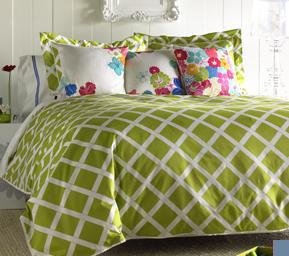 Stroll through England's royal botanical gardens amidst the verdant Kew duvet set depicting a graphic pattern of white trellis against fresh green cotton sateen. Our duvet set makes a modern statement on its own or sets a clean stage for the freshly cut flora of our garden inspired pillows. Flat white piping trims this garden scene and matching trellis pillow shams. Duvet and shams reverse to brilliant white. -Twin set includes duvet and one sham